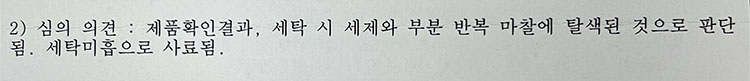 - 사유: 세탁 시 세제와 부분 반복 마찰에 탈색된 것으로 판단됨. 세탁미흡으로 사료됨.