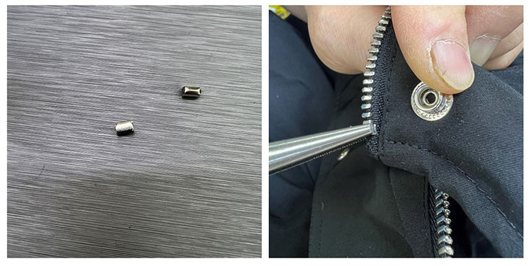 지퍼 고리를 빼기 위해선 먼저 지퍼 끝단의 양쪽 (좌, 우) 금속 마감 부품(상지)을 제거해야 합니다. 이빨의 간격과 다르게 상지는 더 넓게 부착되어 슬라이더가 빠지지 않게 하는 역할을 하는데, 펜치를 사용해 상지를 좌우로 조심스럽게 벌려 빼내면 됩니다.